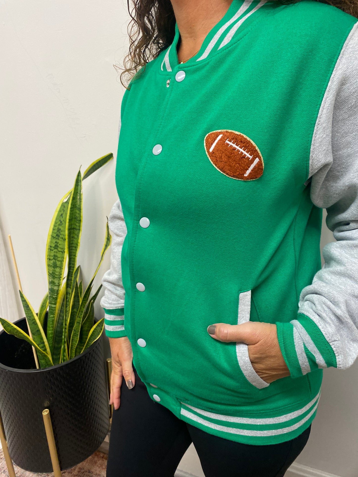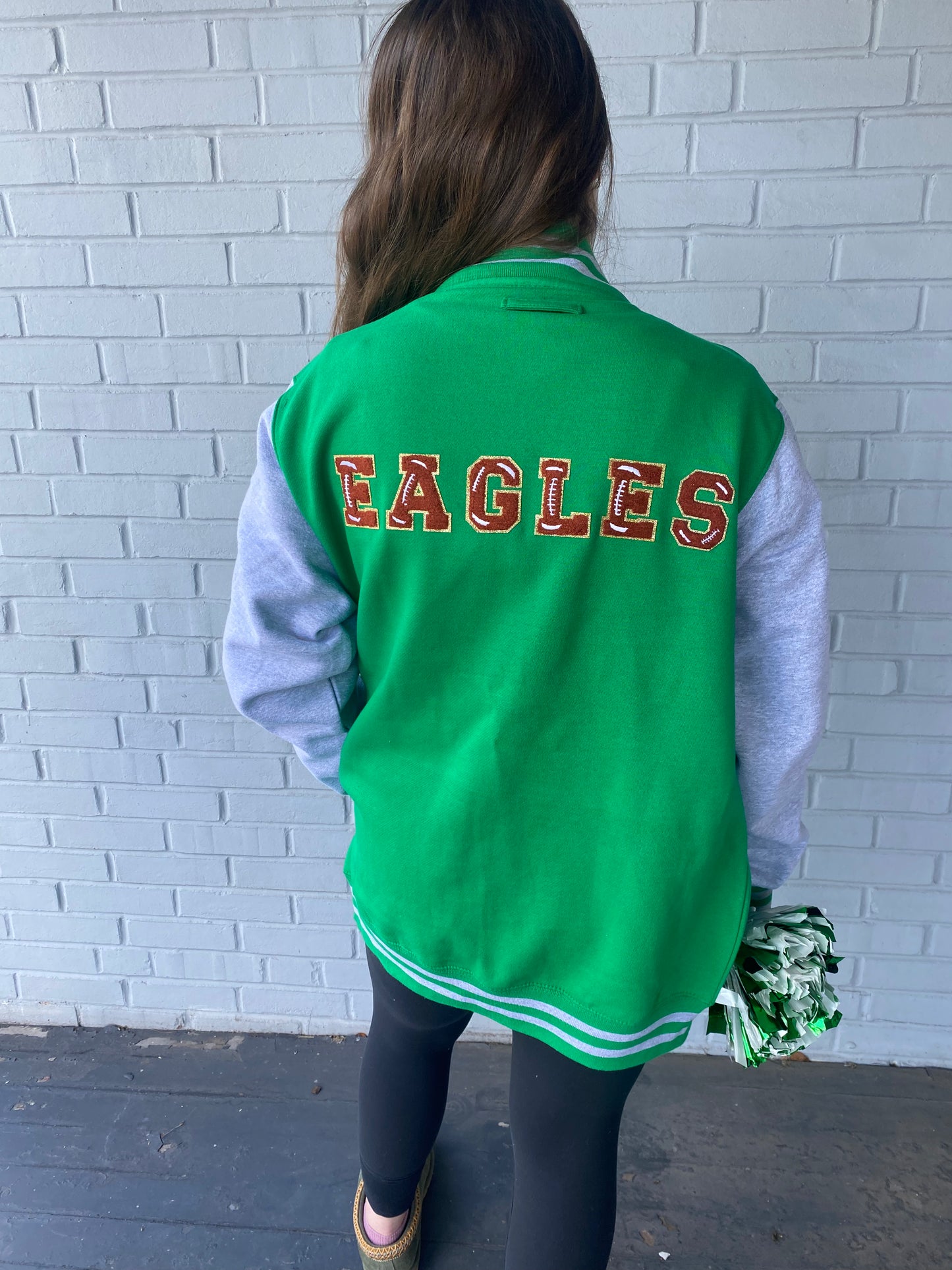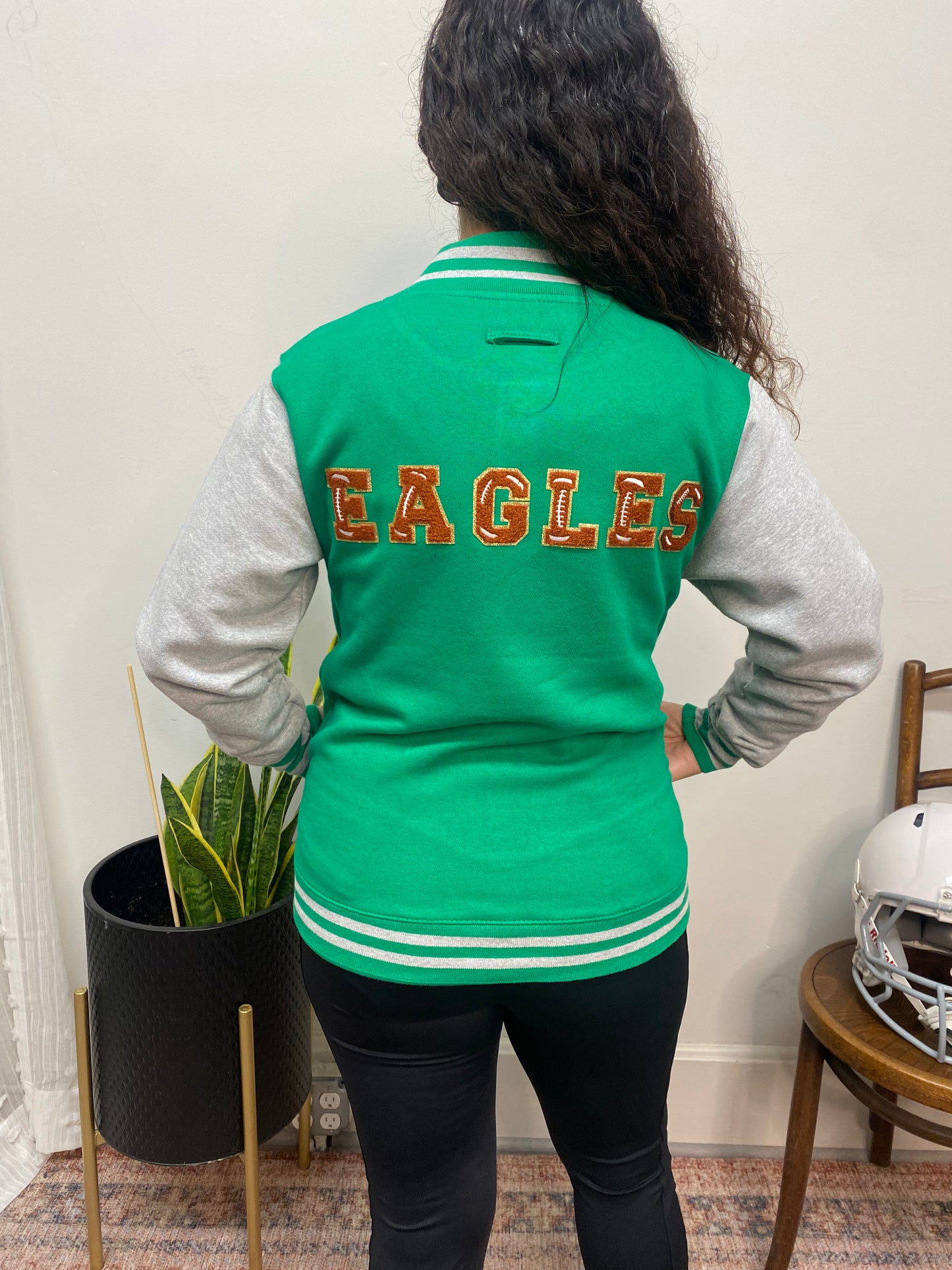 Score major style points with this Eagles Varsity Letter Varsity Jacket. The combo of cool grey and green, the oh-so-dapper combination of snap buttons, and the iconic Eagles football patches come together to deliver a fierce, yet super-fresh look. Game on!