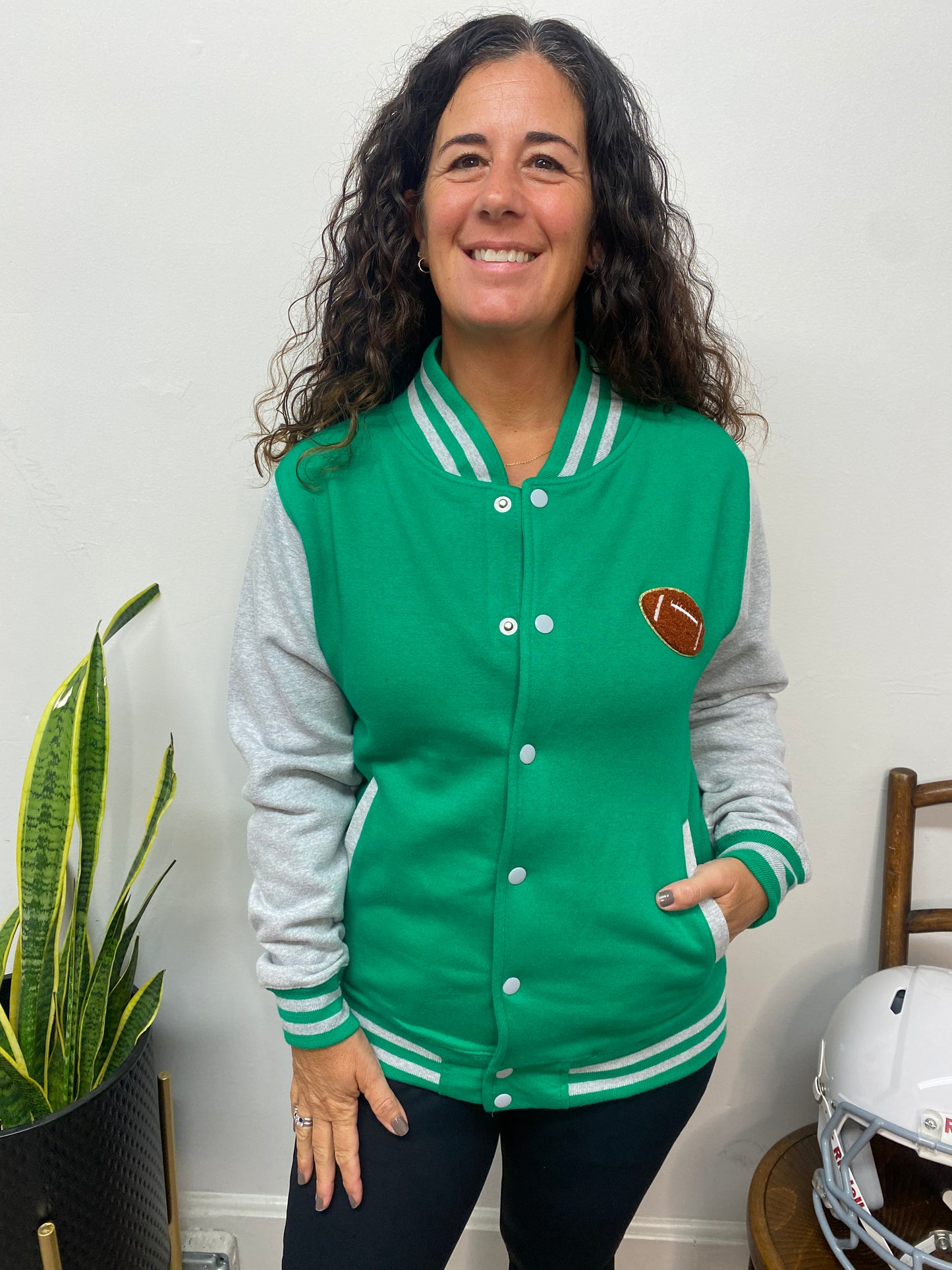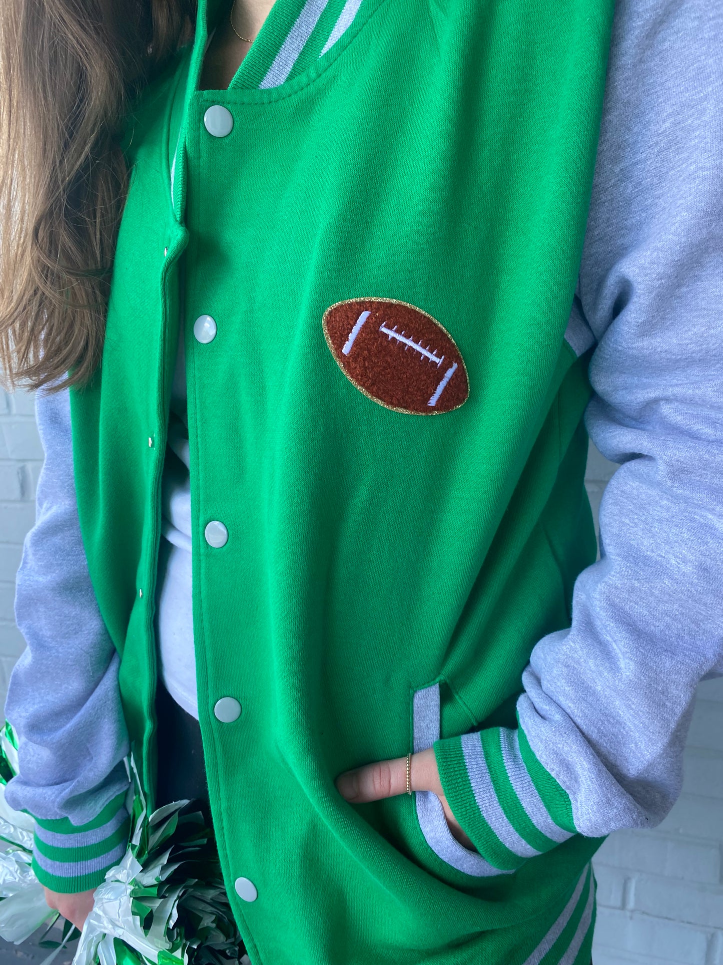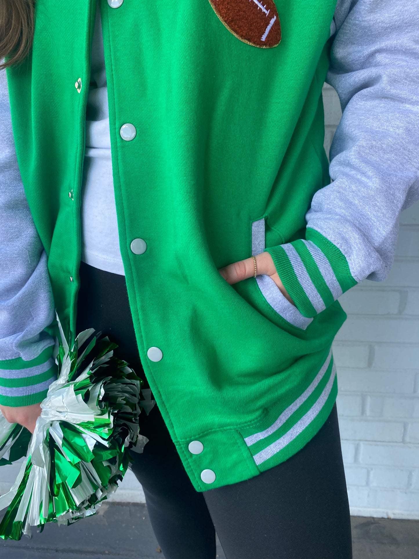 Score major style points with this Eagles Varsity Letter Varsity Jacket. The combo of cool grey and green, the oh-so-dapper combination of snap buttons, and the iconic Eagles football patches come together to deliver a fierce, yet super-fresh look. Game on!