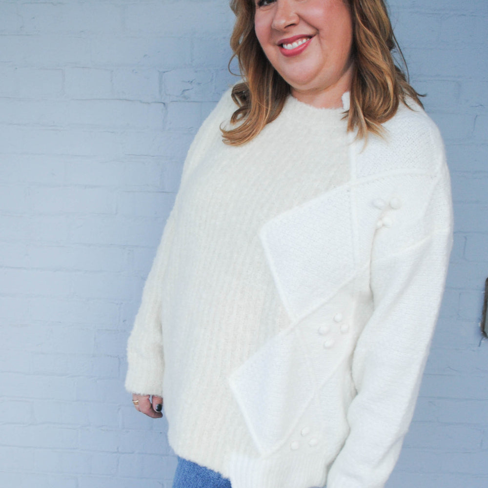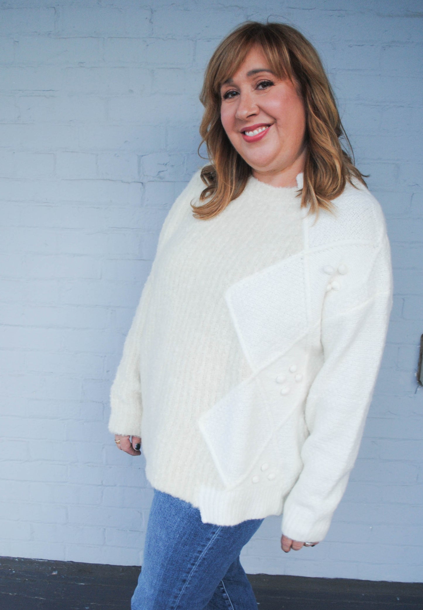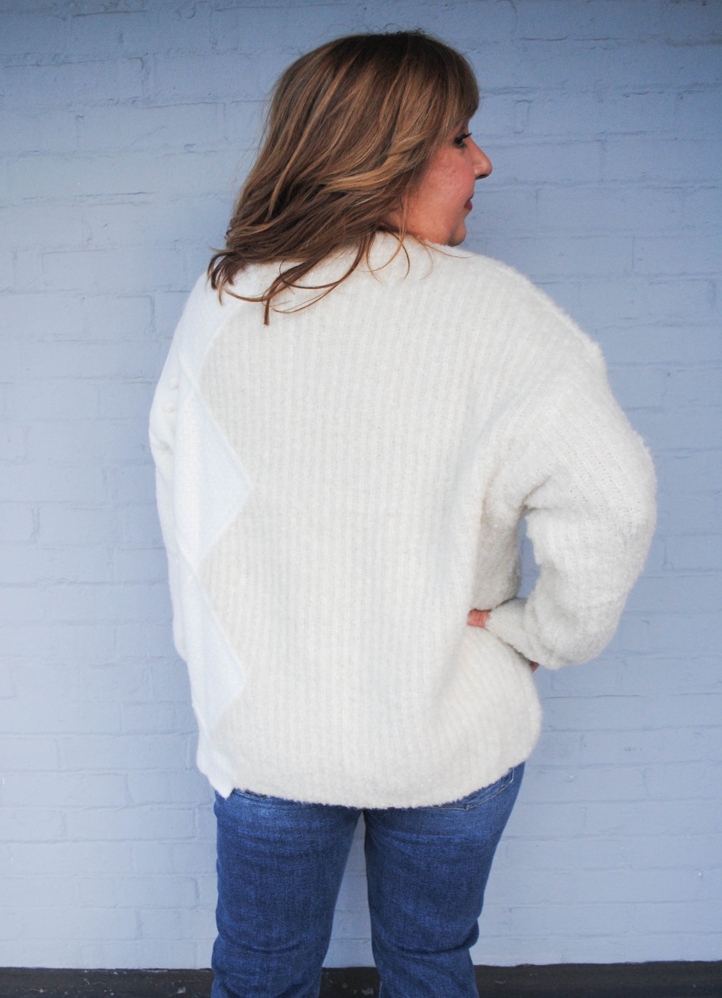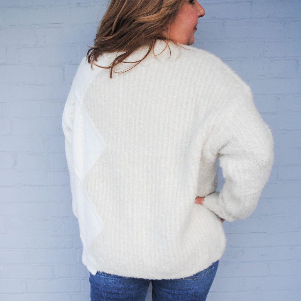 Experience cozy comfort and effortless style with Fireside Flirt Sweater, a stunning CONTRAST KNIT SWEATER in a warm cream and crisp white color. The oversized fit adds a touch of relaxed elegance to any look. Don't miss out on this must-have piece for your wardrobe!