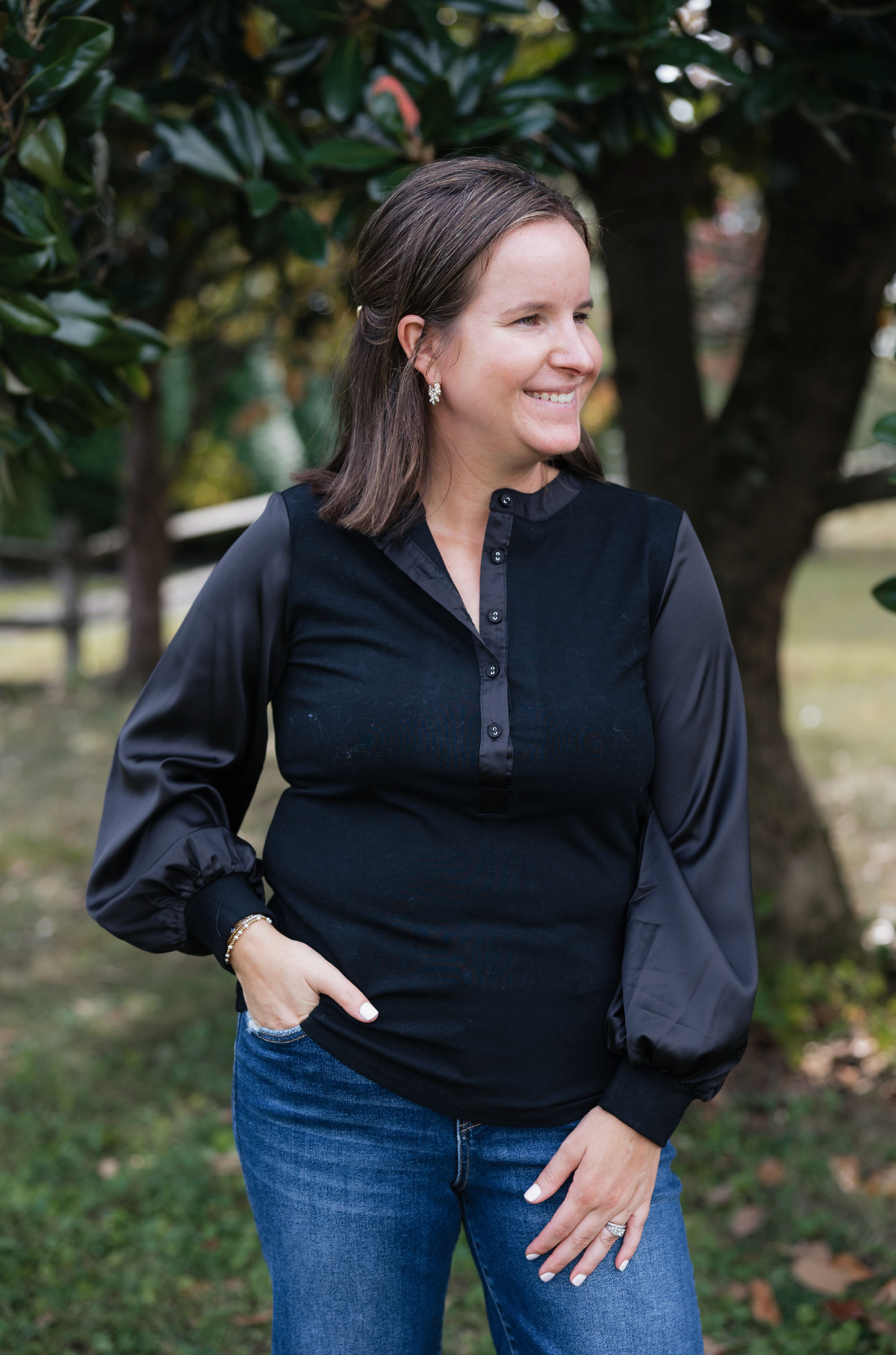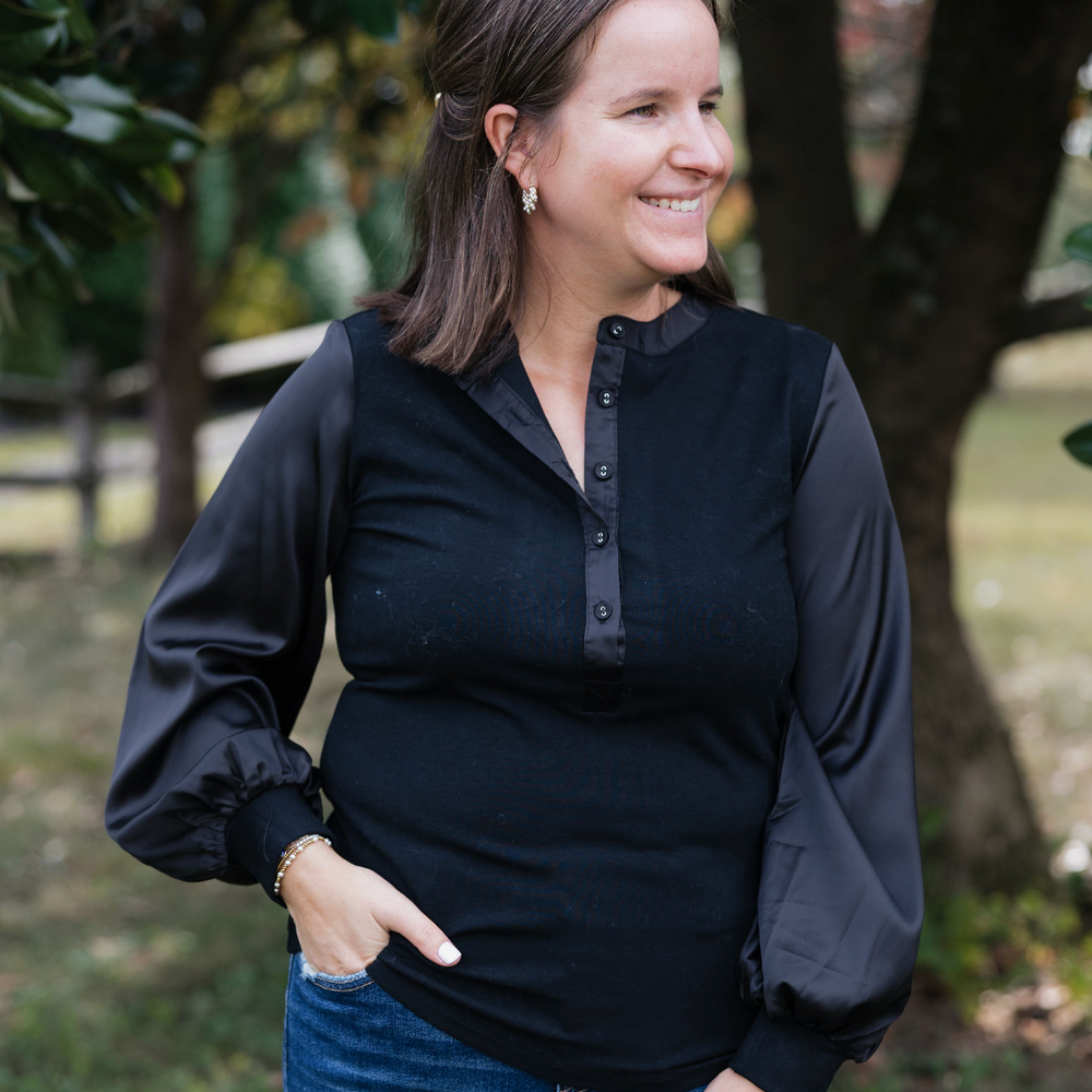 Stylish and sophisticated, the Janie top is a ribbed satin sleeve black top makes a great addition to any wardrobe. The Janie can be paired with a denim of choice. A ribbed body, collarless neckline, and satin sleeves enhance this top.