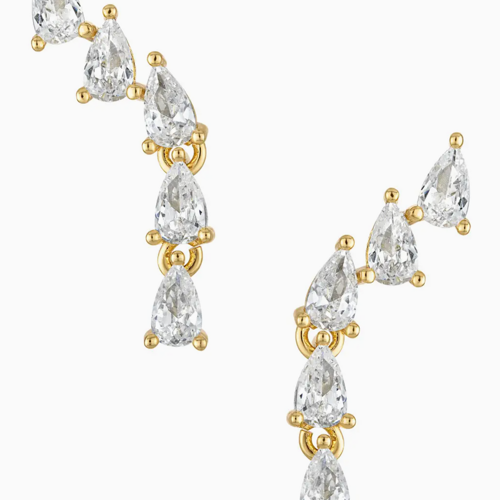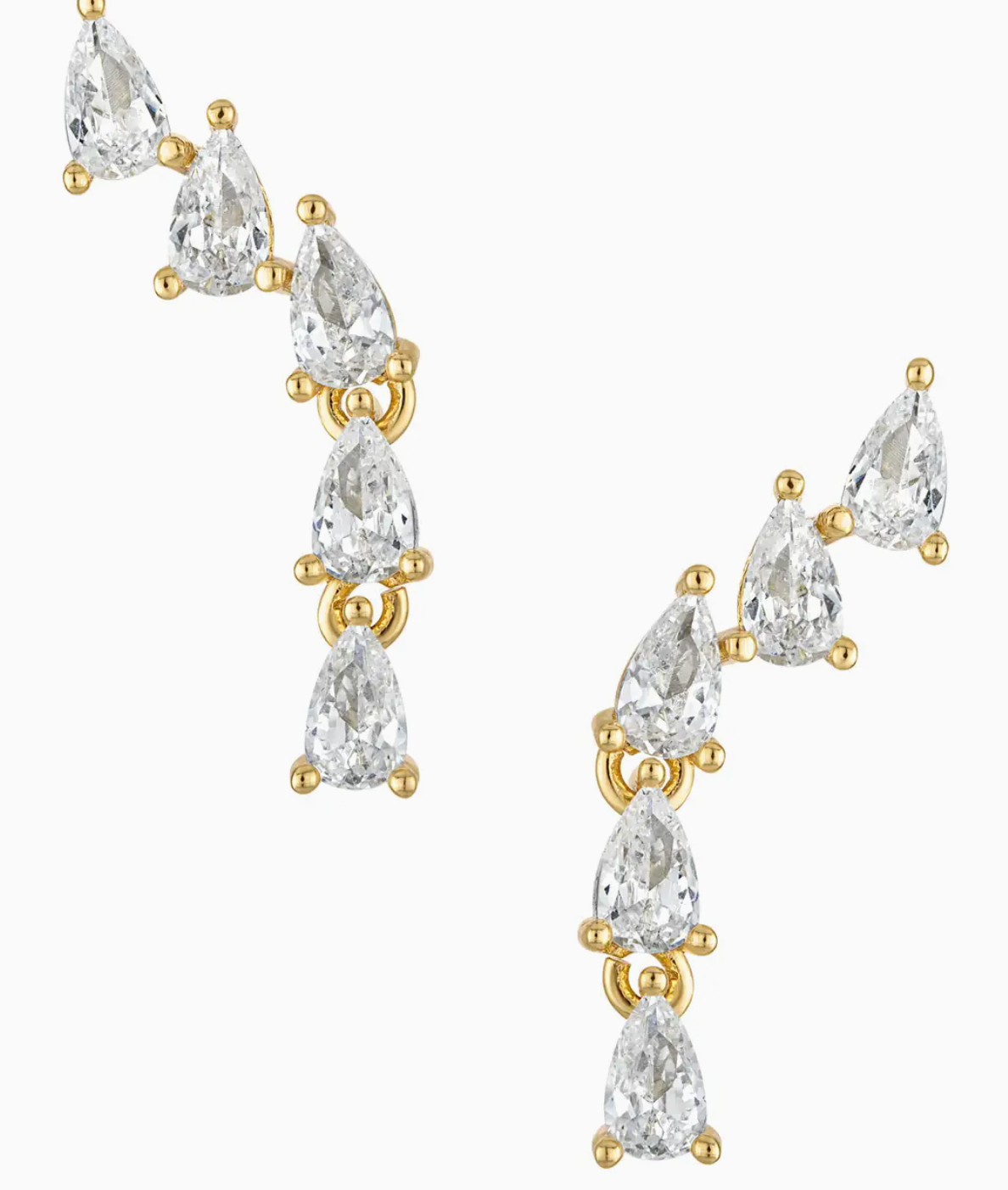 Bring a refined sparkle with our Paloma Teardrop Climber Earrings. Designed to sweep effortlessly across the ear, these climbers capture the light and complement. These earrings feature a cascade of pear-shaped CZ stones in an arc gently curved upward to mimic the natural allure of the ear. Stack these earrings with our Denise Necklace to add subtle glamour, or wear them alone to let the shape take center stage. Perfect gift for graduation, bridesmaids, or birthdays, our Paloma Teardrop Climber Earrings say, “You’re Unforgettable” without words.