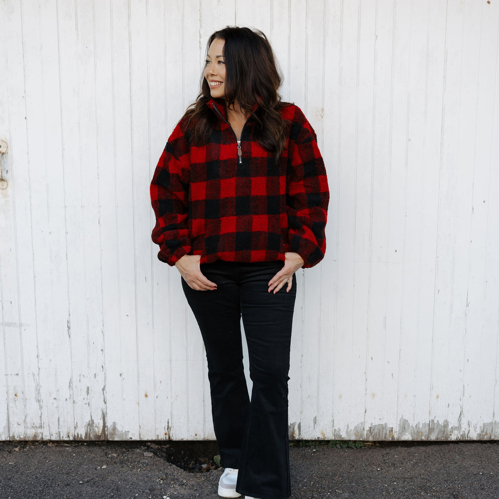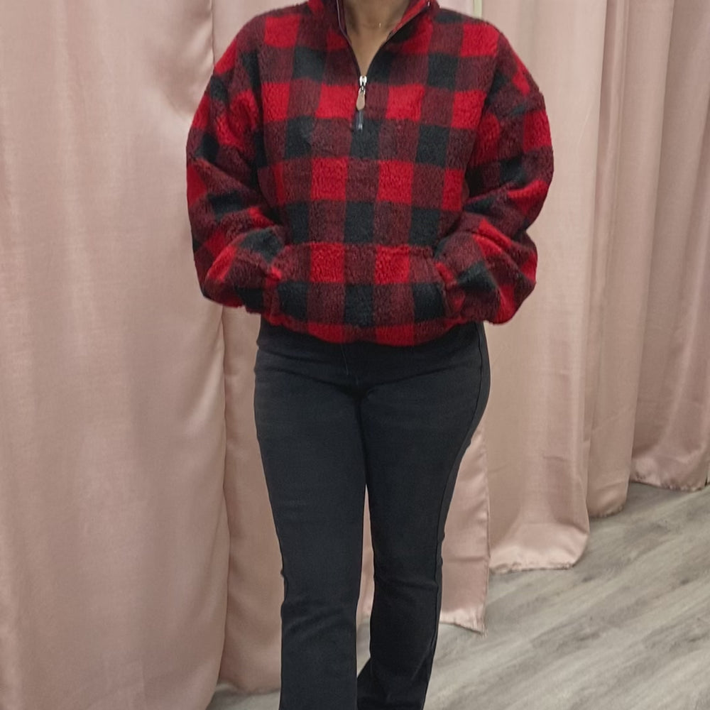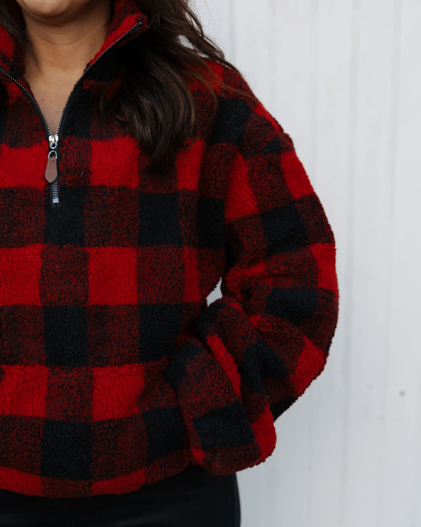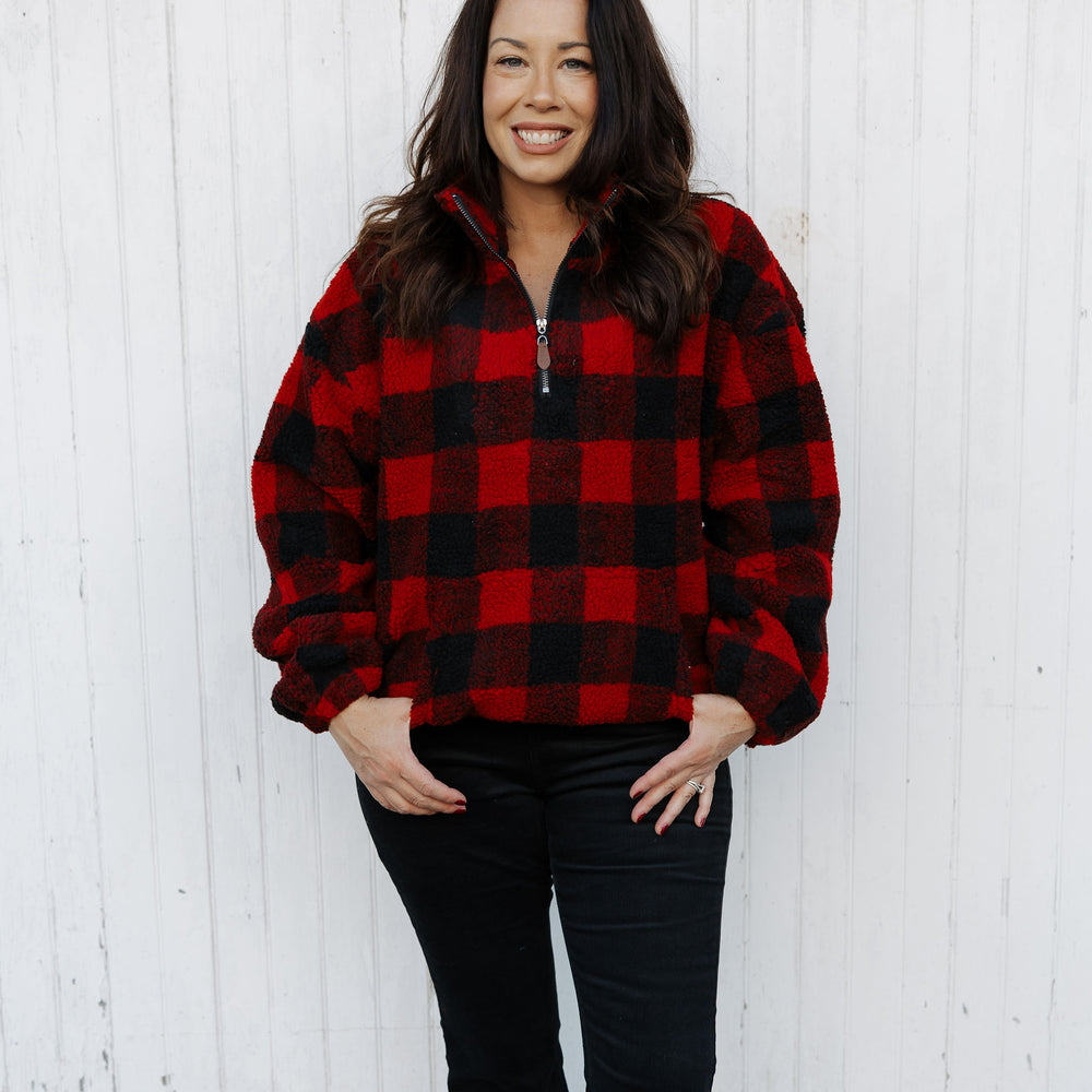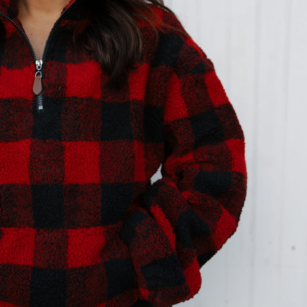Regular price $25.00This snuggly pullover is a comfy and chic wardrobe essential! Its half-zip design boasts up-to-date style and an easier fit. Crafted from a fabulously fluffy fabric, you'll love its cozy feel and toasty-warmth. The classic plaid pattern adds a delightful detail, and there's even a handy kangaroo pocket on the front for your everyday essentials. Stylin' and functional! Red & black 1/4 zip sherpa pullover