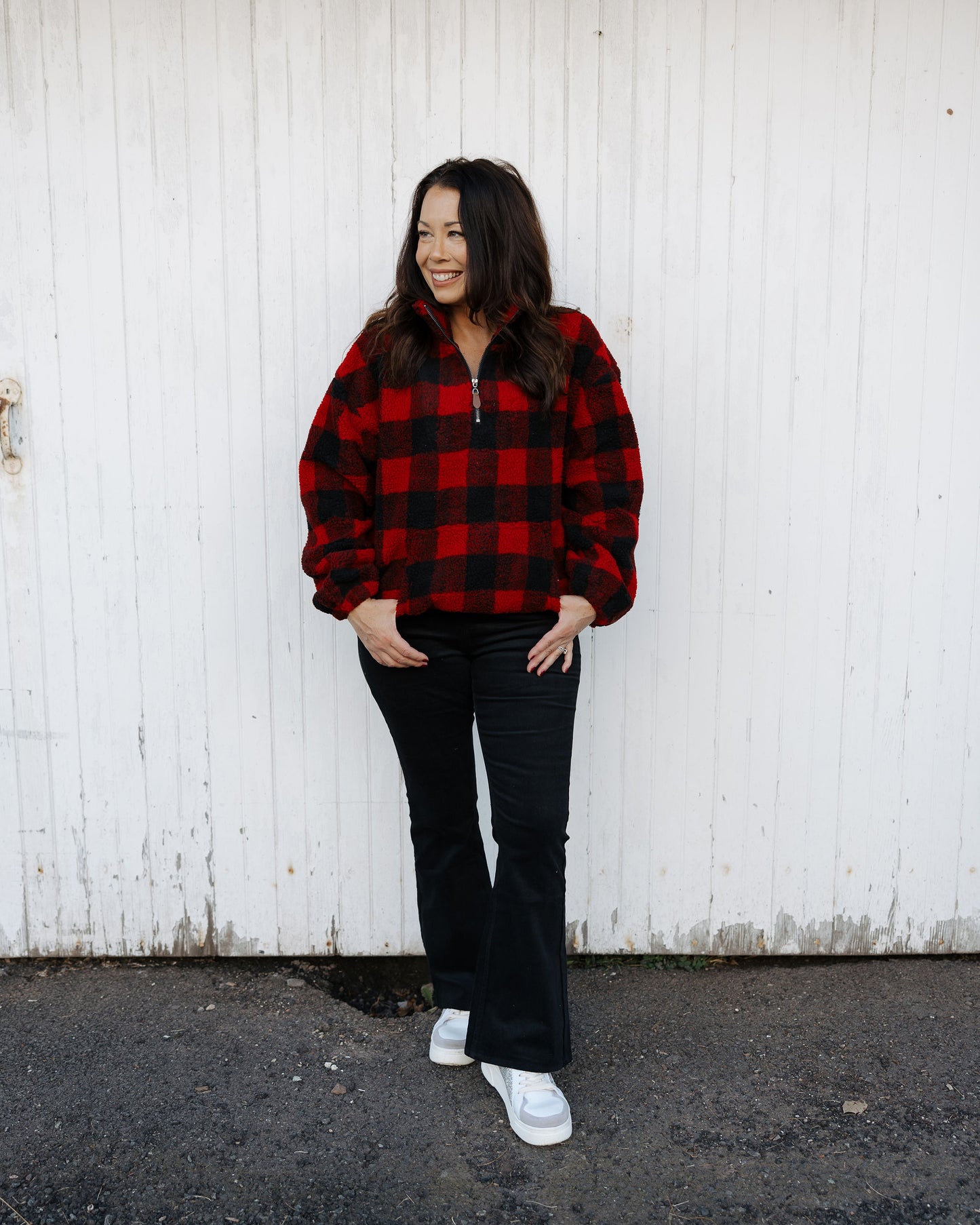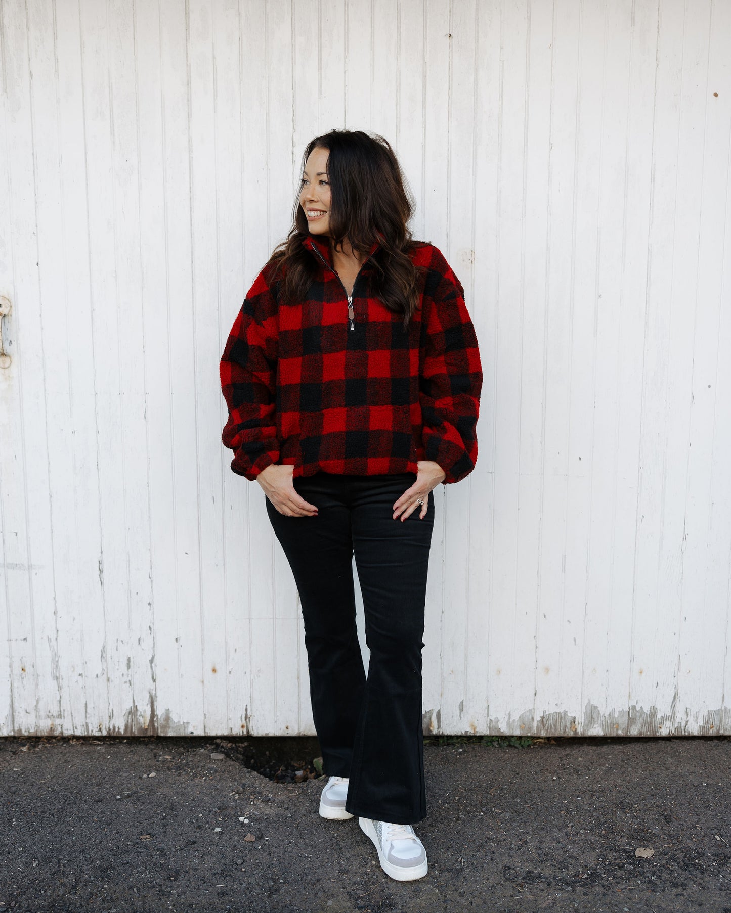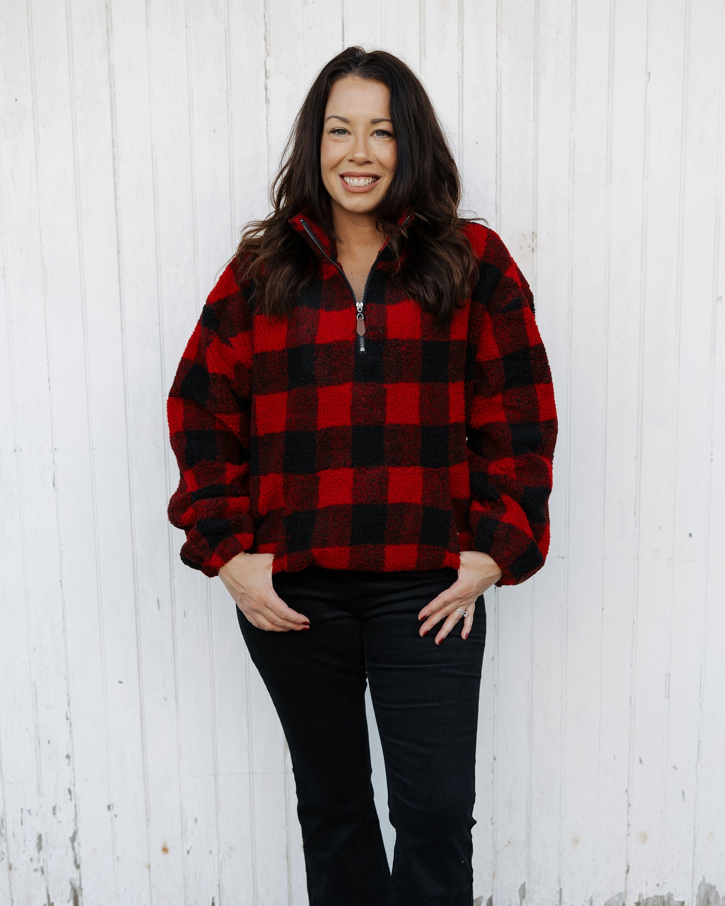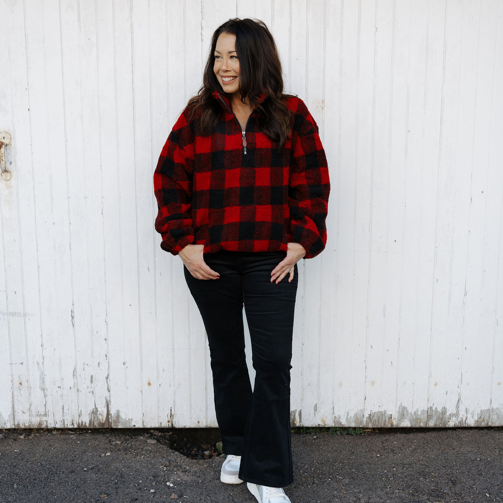 Regular price $25.00This snuggly pullover is a comfy and chic wardrobe essential! Its half-zip design boasts up-to-date style and an easier fit. Crafted from a fabulously fluffy fabric, you'll love its cozy feel and toasty-warmth. The classic plaid pattern adds a delightful detail, and there's even a handy kangaroo pocket on the front for your everyday essentials. Stylin' and functional! Red & black 1/4 zip sherpa pullover