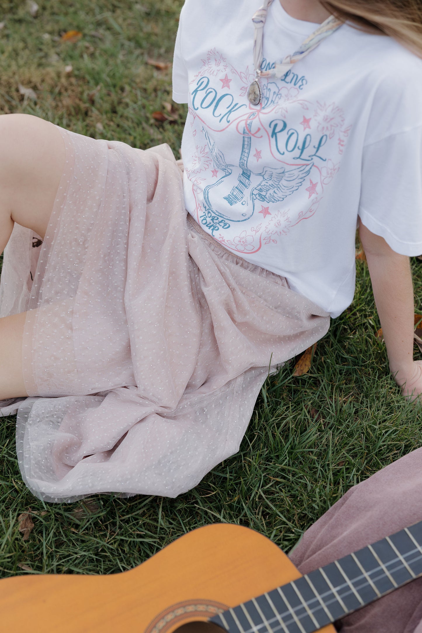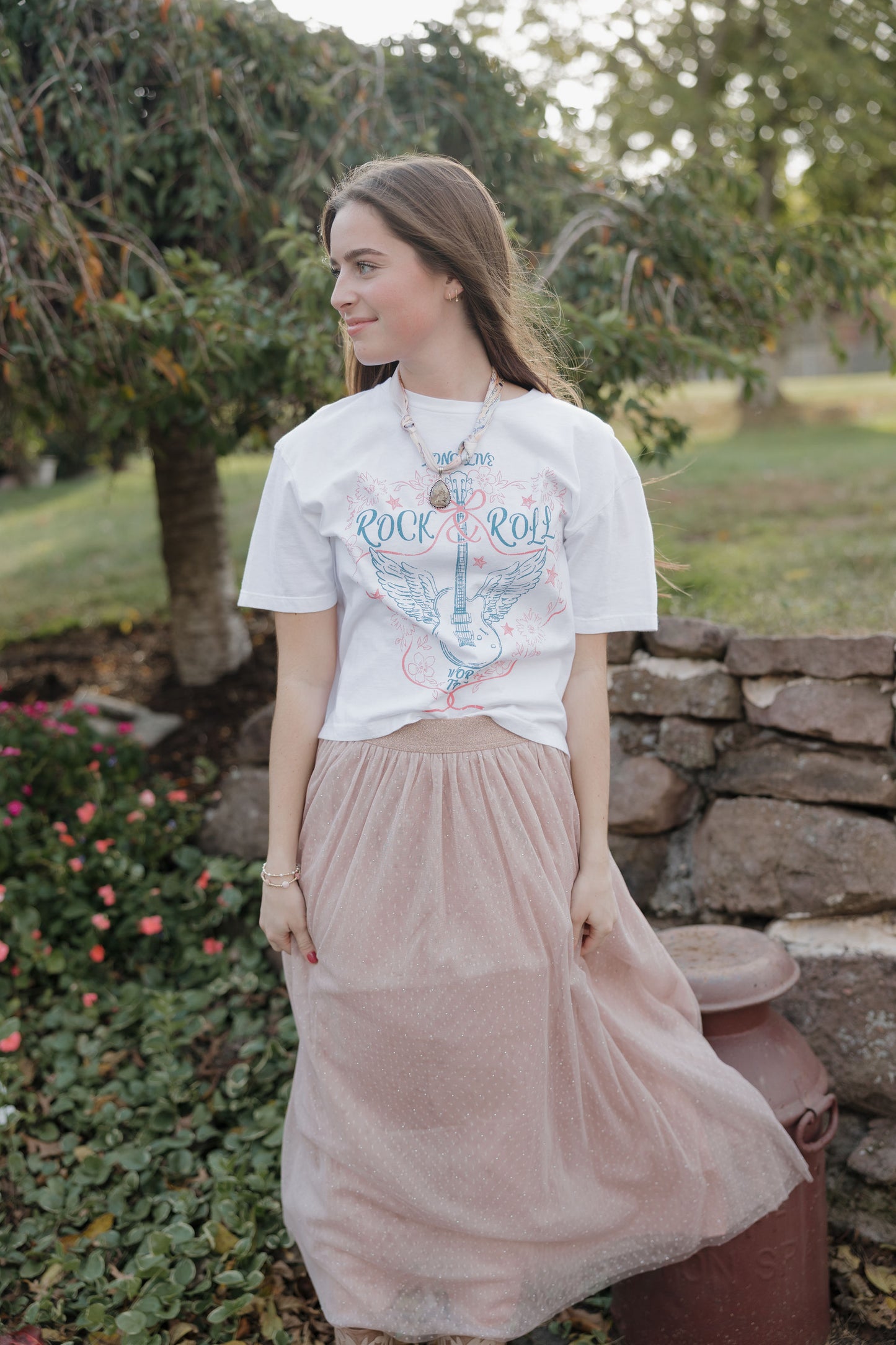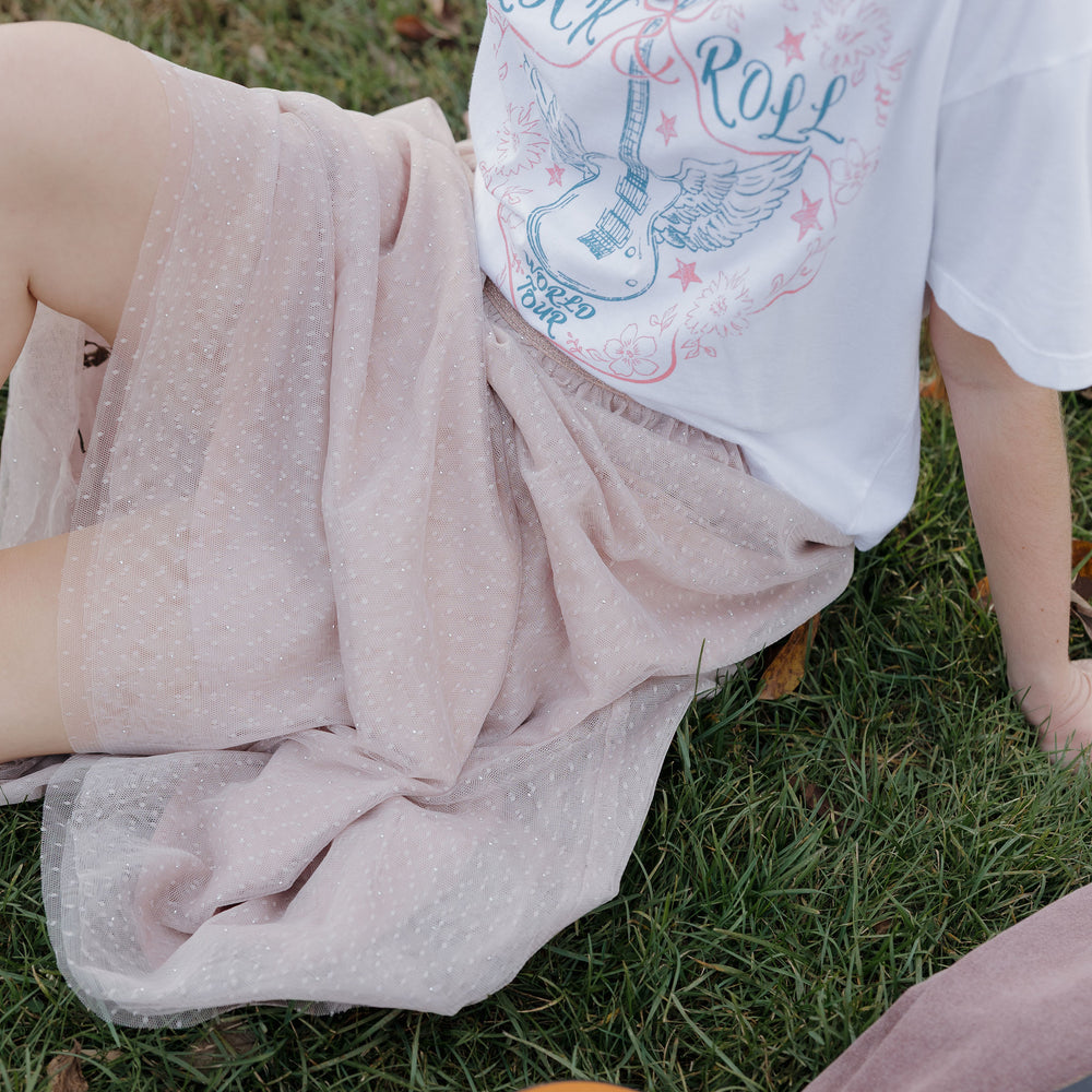 This Peach Gold Tulle delightful skirt shines with glittering sparkle and lightweight mesh, gracefully hitting a flattering mid-length. It boasts an elastic stretch waistband with a glittery band, an A-line silhouette, and is sprinkled with tiny gemstones for extra charm.
