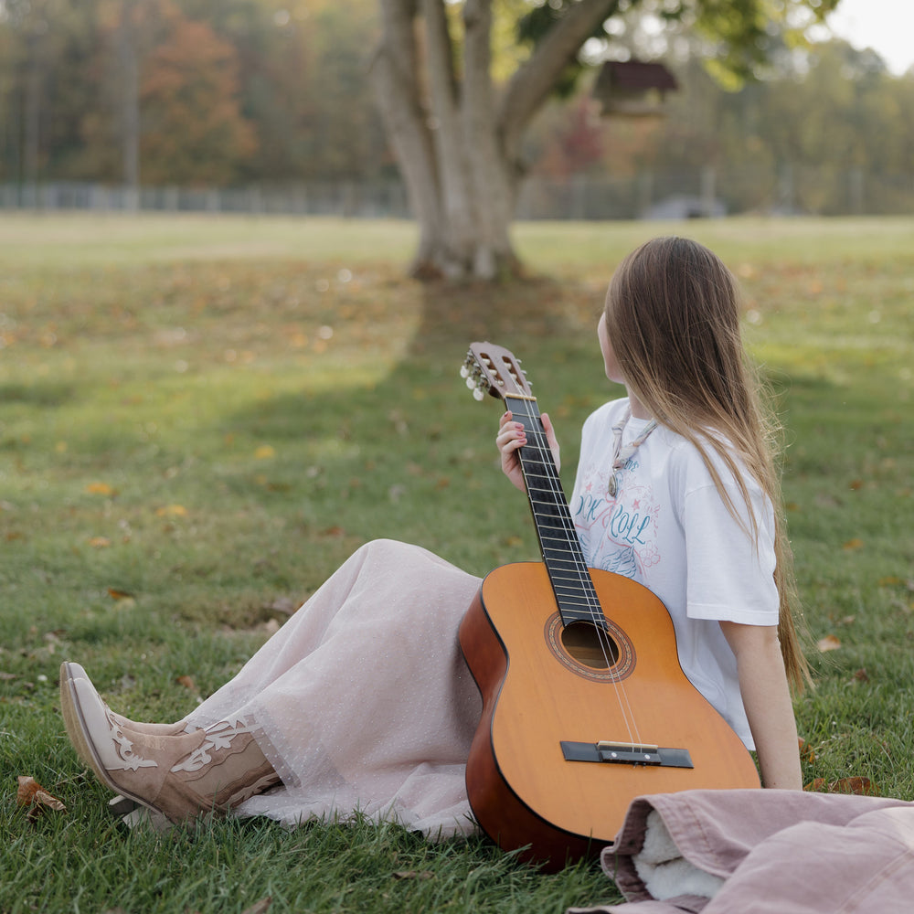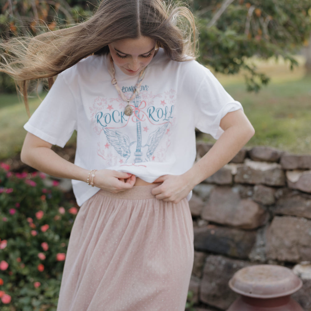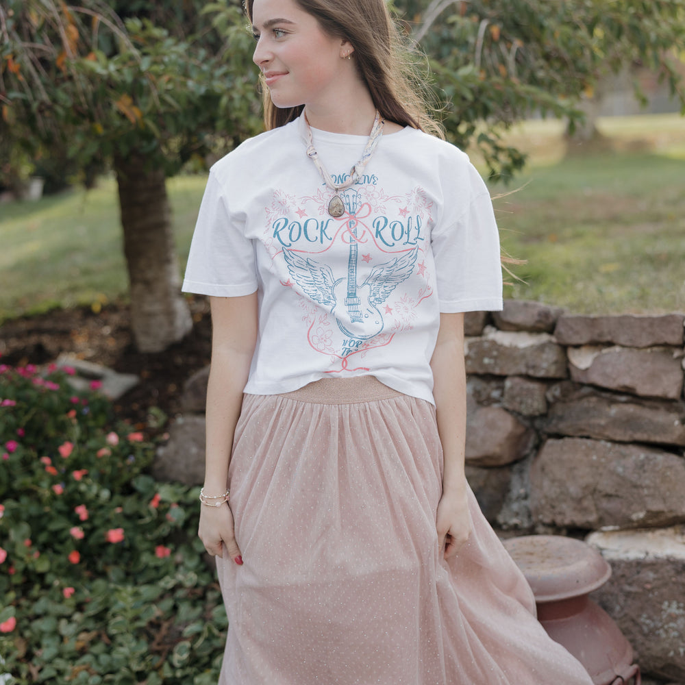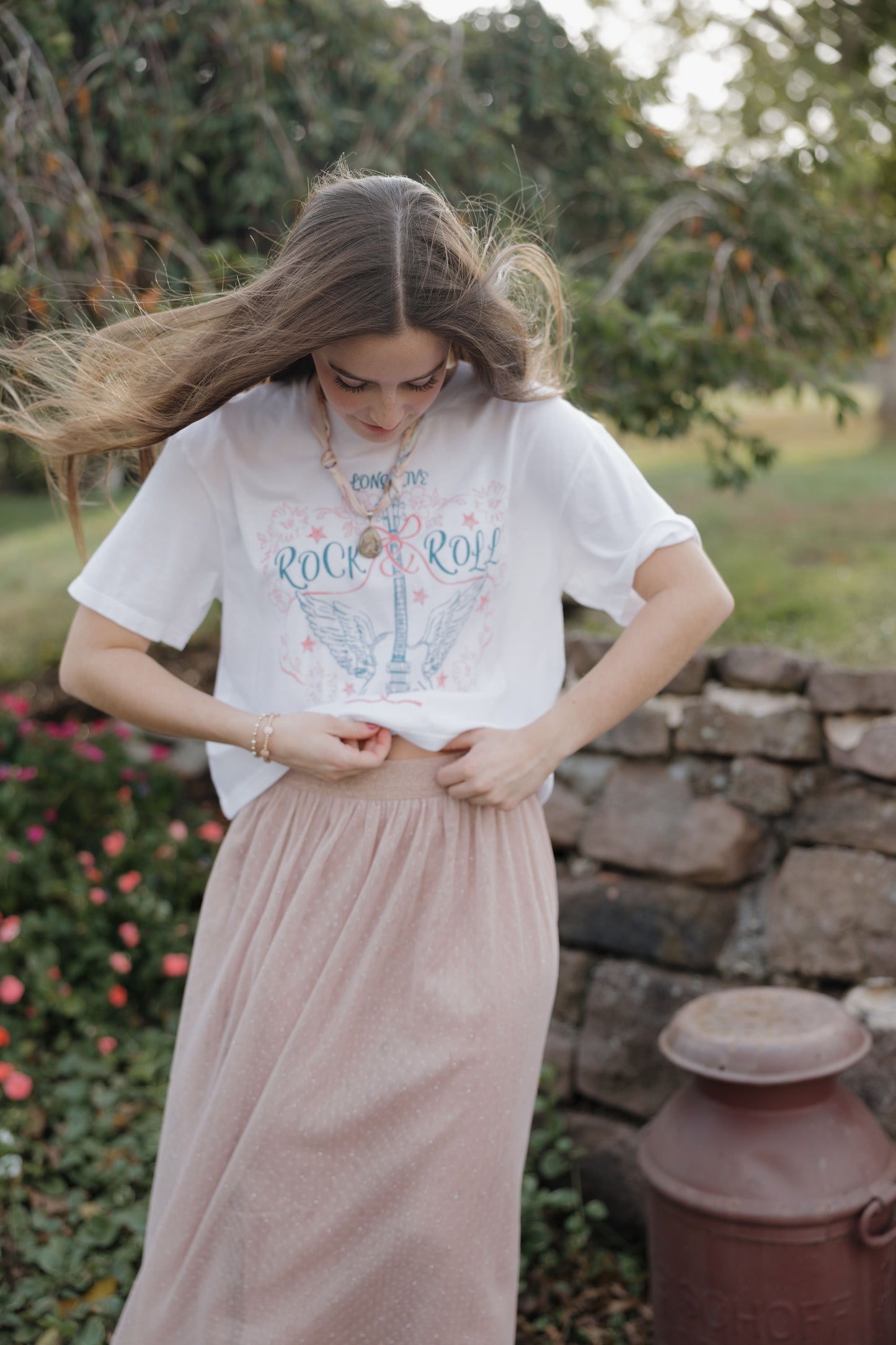 This Peach Gold Tulle delightful skirt shines with glittering sparkle and lightweight mesh, gracefully hitting a flattering mid-length. It boasts an elastic stretch waistband with a glittery band, an A-line silhouette, and is sprinkled with tiny gemstones for extra charm.